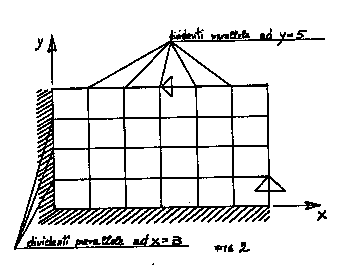 la visualizzazione degli spostamenti e delle sollecitazioni nella lastra durante la quale all’operatore è richiesto soltanto di assegnare la coppia di numeri che individuano il nodo del reticolo e l’elaboratore visualizza in risposta, e relativamente al nodo assegnato, le seguenti quantità: